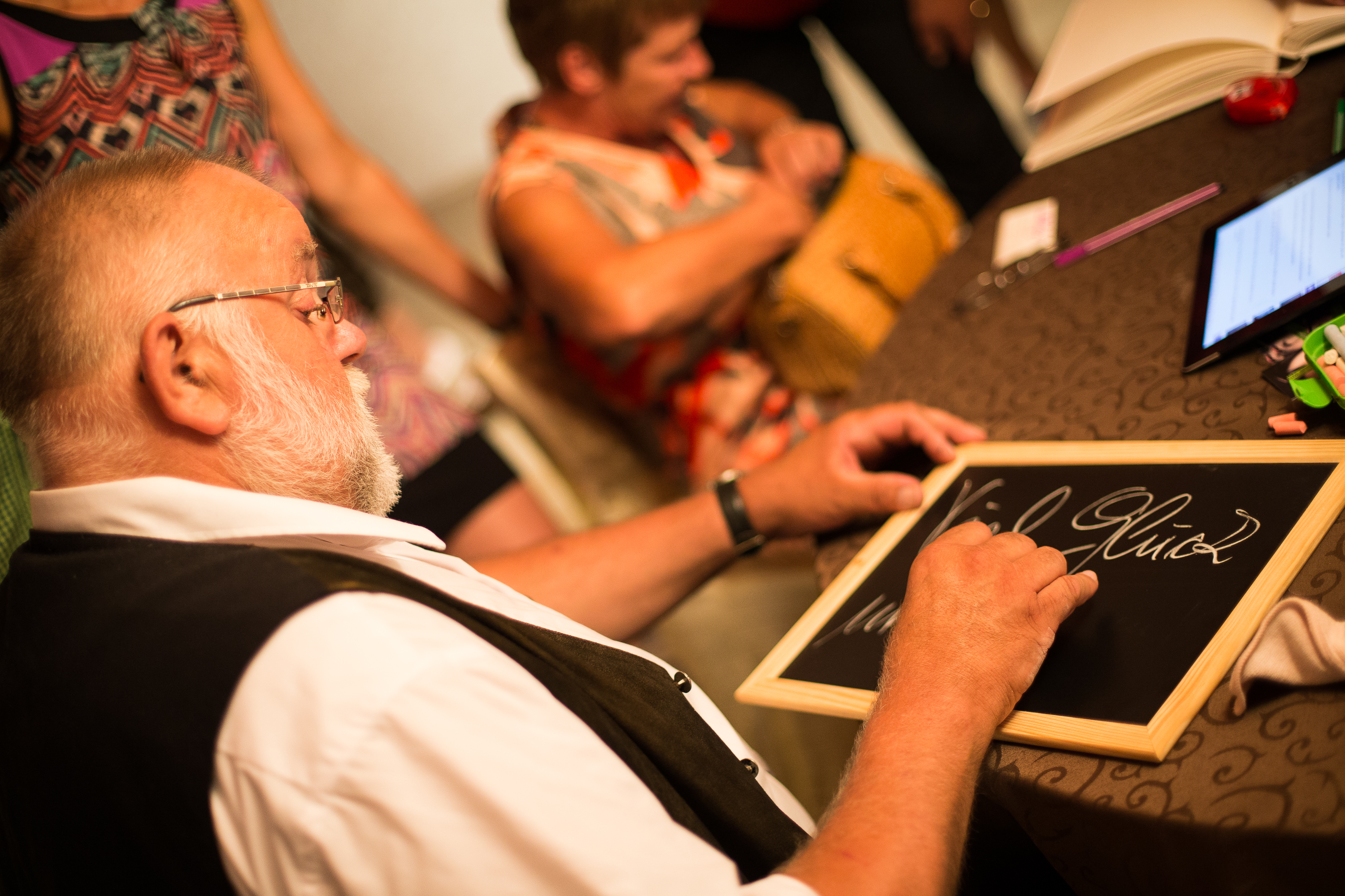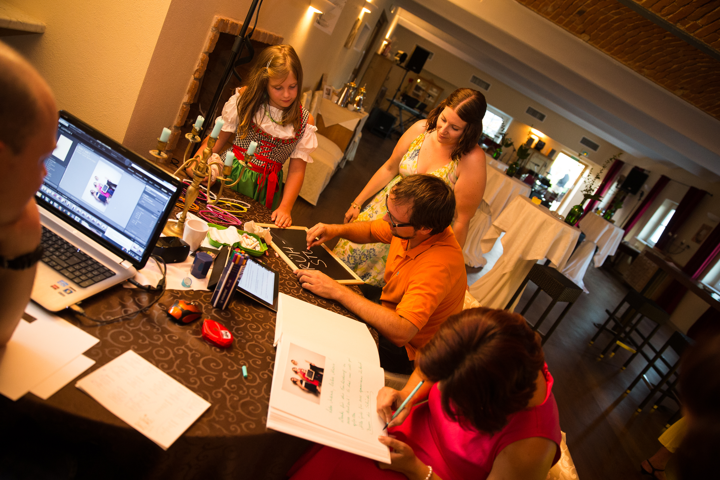 Hierbei werden einzelne Gäste oder Gruppen von uns vor einem geeigneten Hintergrund und mit profesioneller Blitzanlage abgelichtet. Diese Bilder werden sofort nach der Entstehung bearbeitet, ausgedruckt und in ein Gästebuch geklebt, wo auch jeder Gast noch seine Glückwünsche ausrichten kann.